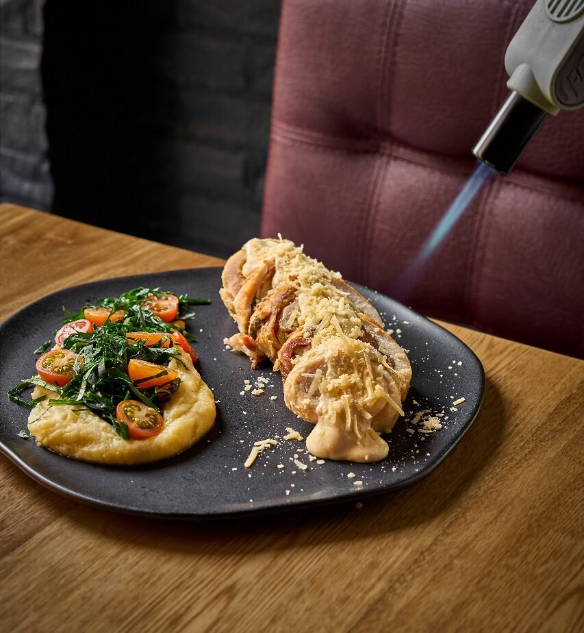 Pechuga rellena de queso,tocine y albahaca acompañada de un pure cremoso con espinaca tomate aceite de oliva sal y pimienta