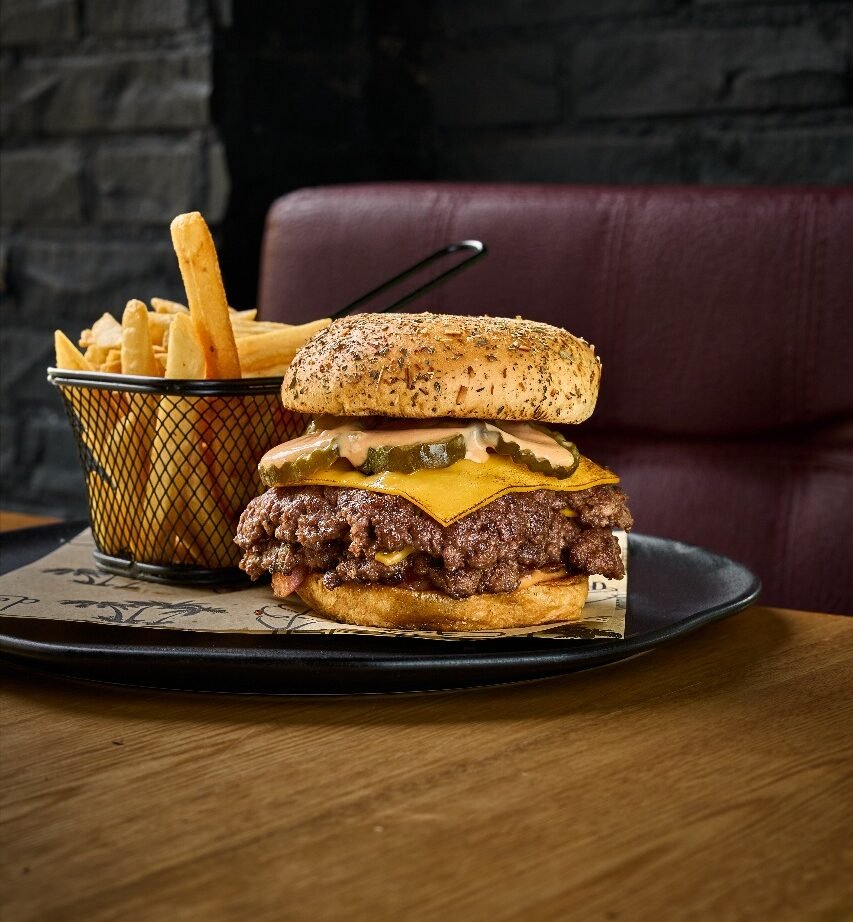 Pan atesanal tipo brioche, 2 carnes de 100g al estilo smash, cubiertas con doble queso fundido, tocineta en trozos y pepinillos agridulces. Todo esto acompañado con nuestra salsa Stiker.