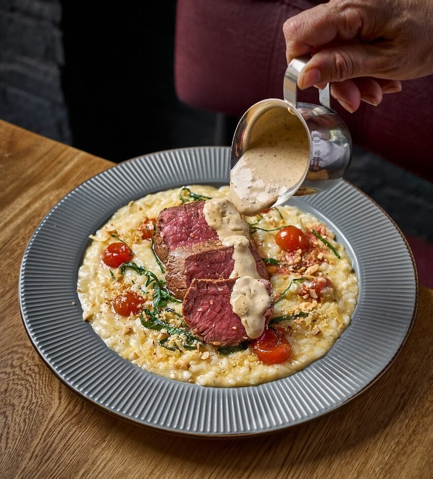 200gr de solomito con salsa de trufa sobre risotto con tomates confitados albahaca y nueces